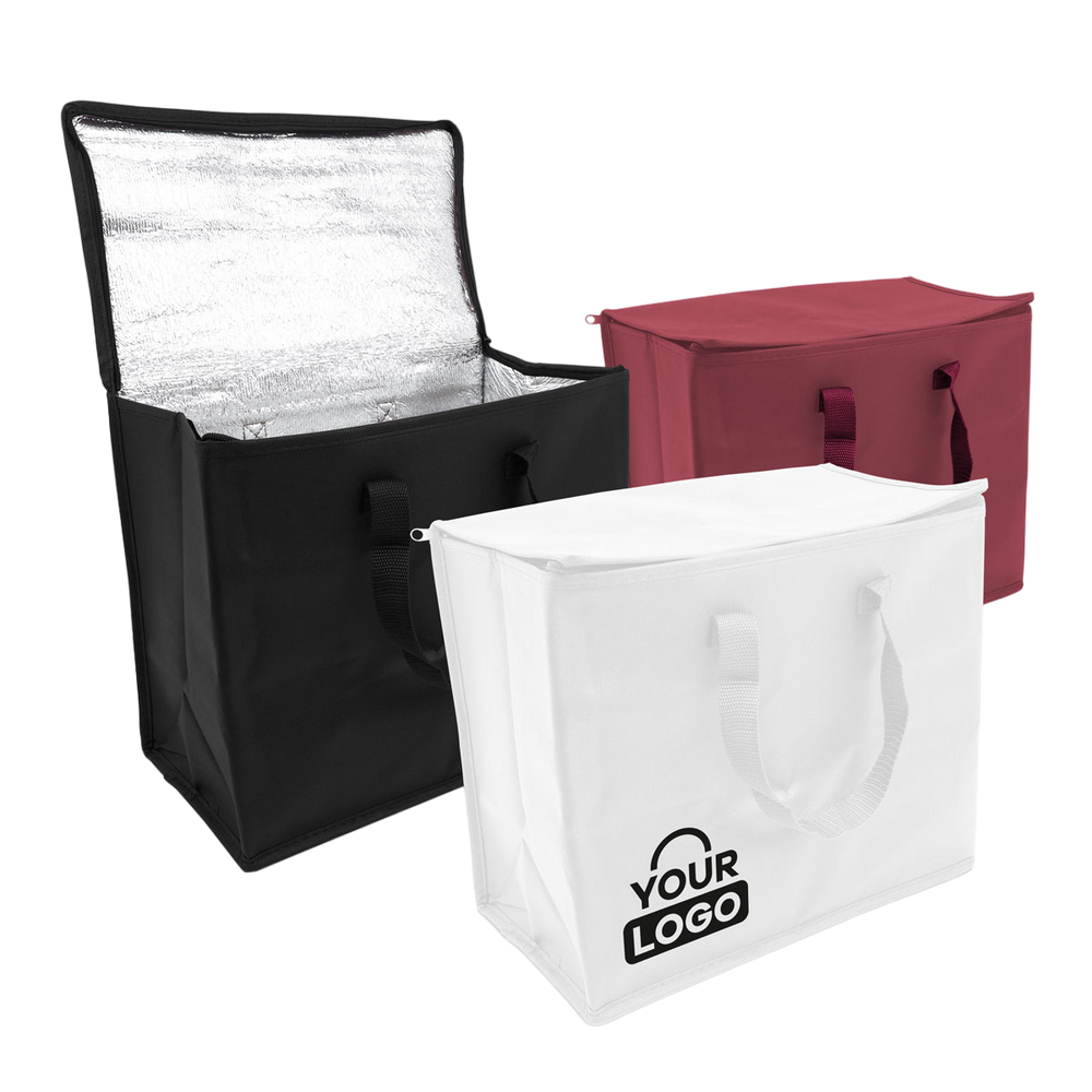 Voor bedrukte koeltassen kiest u onze non-woven koeltassen met aluminium binnenvoering. De tassen zijn op maat te maken, inclusief formaat, kleur, handvatten, en ritssluiting of klittenbandsluiting. Een ecologisch alternatief in gerecycled materiaal is ook mogelijk. Bekijk de uitvoeringen hieronder.