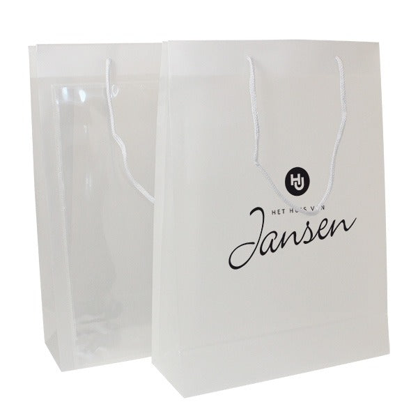 Voor promotionele acties op beurzen en evenementen zijn de luxe plastic venstertassen met insteekvenster een uitstekende keuze. Met een transparant venster aan de voorzijde kunt u eenvoudig promotiemateriaal of informatieboekjes presenteren. Deze tasjes, gemaakt van sterk 180-micron PP, zijn zowel stijlvol als praktisch en beschikken over witte koorden voor een luxe uitstraling.