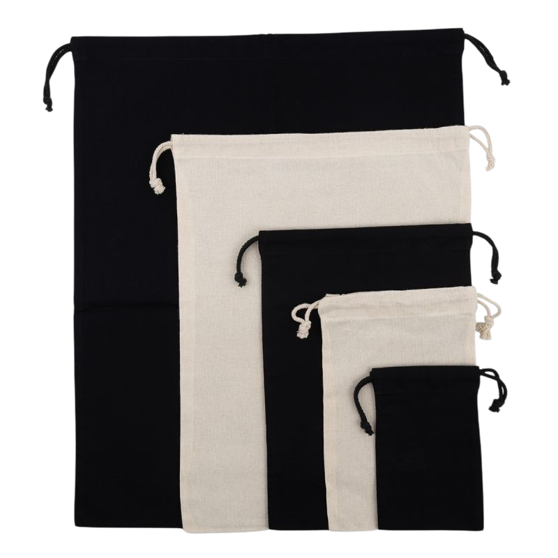 Katoenen zakjes zijn niet alleen mooi, maar ook herbruikbaar – ideaal voor duurzame verpakkingen van o.a. sieraden, kleding of cadeauartikelen. Verkrijgbaar in ecru (ongebleekt) of zwart katoen, in diverse formaten.