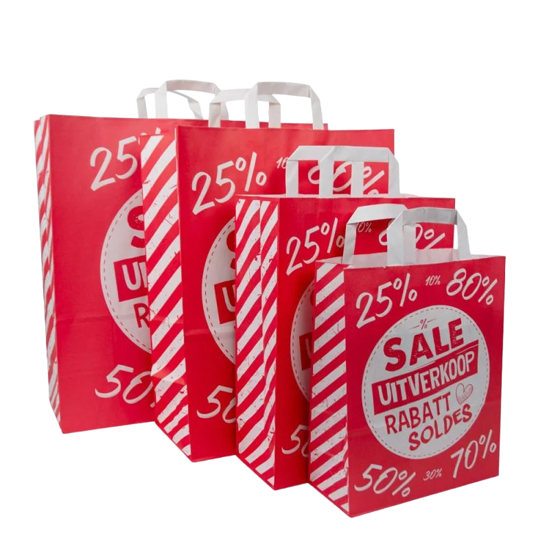 Zoekt u een voordelige, milieuvriendelijke én opvallende tas voor een uitverkoop of speciale actie? Dan zijn onze kraft tassen FSC® – Sale de perfecte keuze. Deze witte papieren tassen zijn bedrukt met een internationale sale-opdruk in het rood – ideaal om klanten meteen in de actie-stemming te brengen.