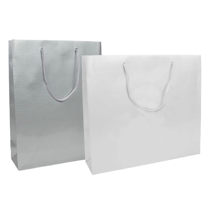 Deze tassen zijn vervaardigd van 190 grams wit papier met een embossed croco-patroon. De glanzende laminaatlaag zorgt voor extra bescherming en maakt de structuur visueel nog krachtiger. De korte katoenen koorden zijn stevig ingeknoopt en dragen comfortabel in de hand – ideaal voor een hoogwaardige presentatie.