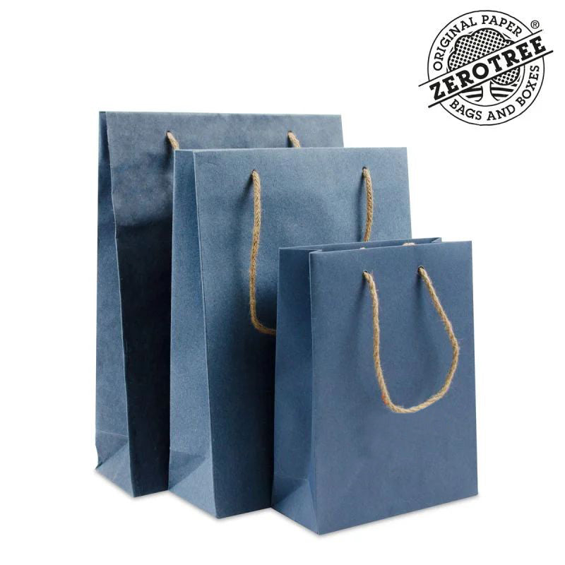 Deze duurzame ZEROTREE® papieren tassen zijn vervaardigd uit 180 grams gerecycled papier, verrijkt met jeansvezels afkomstig van gerecycled denim. Het materiaal heeft een herkenbare lichtblauwe uitstraling en bevat subtiel zichtbare vezels – een uniek en ecologisch alternatief zonder dat er bomen gekapt worden.