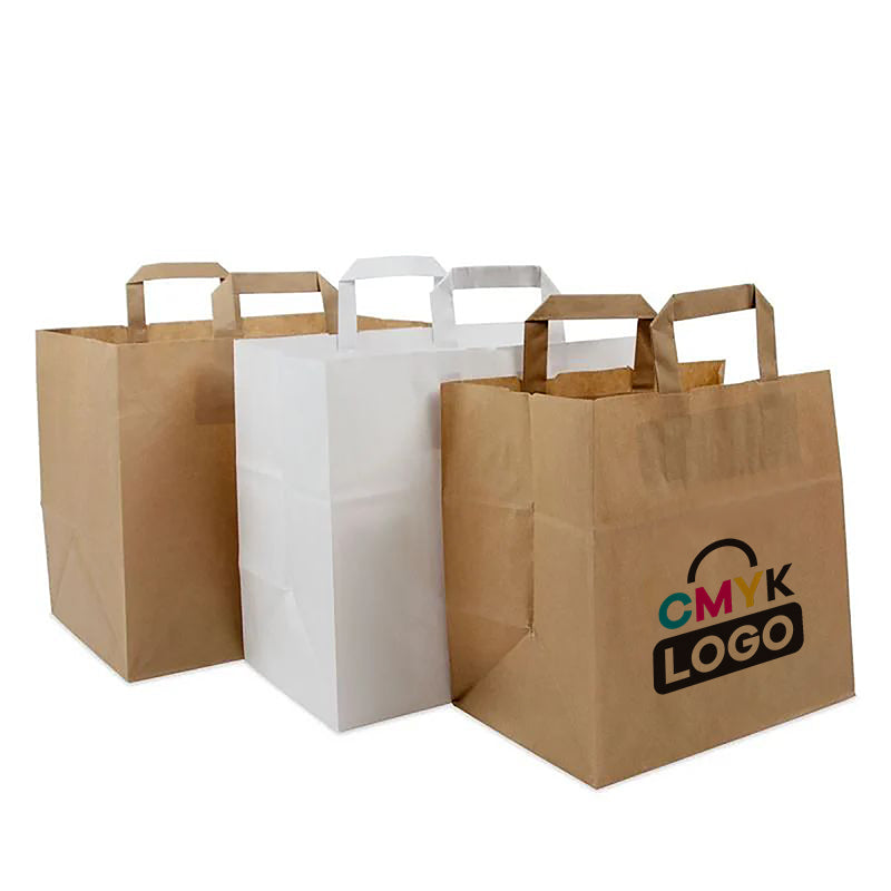 Op zoek naar voordelige en milieuvriendelijke tassen voor uw take away service? Onze papieren take away tassen met platte lussen zijn dé oplossing. Deze praktische tassen zijn gemaakt van 70 grams wit of bruin gerecycled kraftpapier en voorzien van stevige, geplakte handvatten. Dankzij de brede blokbodem zijn ze ideaal voor het verpakken van maaltijden, snacks of sushi boxen. Direct leverbaar uit voorraad in verschillende kleuren en formaten, volledig recyclebaar en snel beschikbaar met of zonder bedrukking.