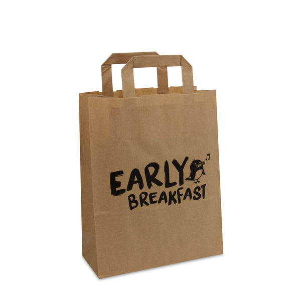 Deze budgetvriendelijke tassen zijn gemaakt van 70 grams bruin kraftpapier en voorzien van een opvallende zwarte opdruk met de tekst “Early breakfast”. De stevige platte papieren lussen zorgen voor comfortabel gebruik. Het ongecoate kraftpapier is volledig recyclebaar en heeft een natuurlijke, ecologische uitstraling.