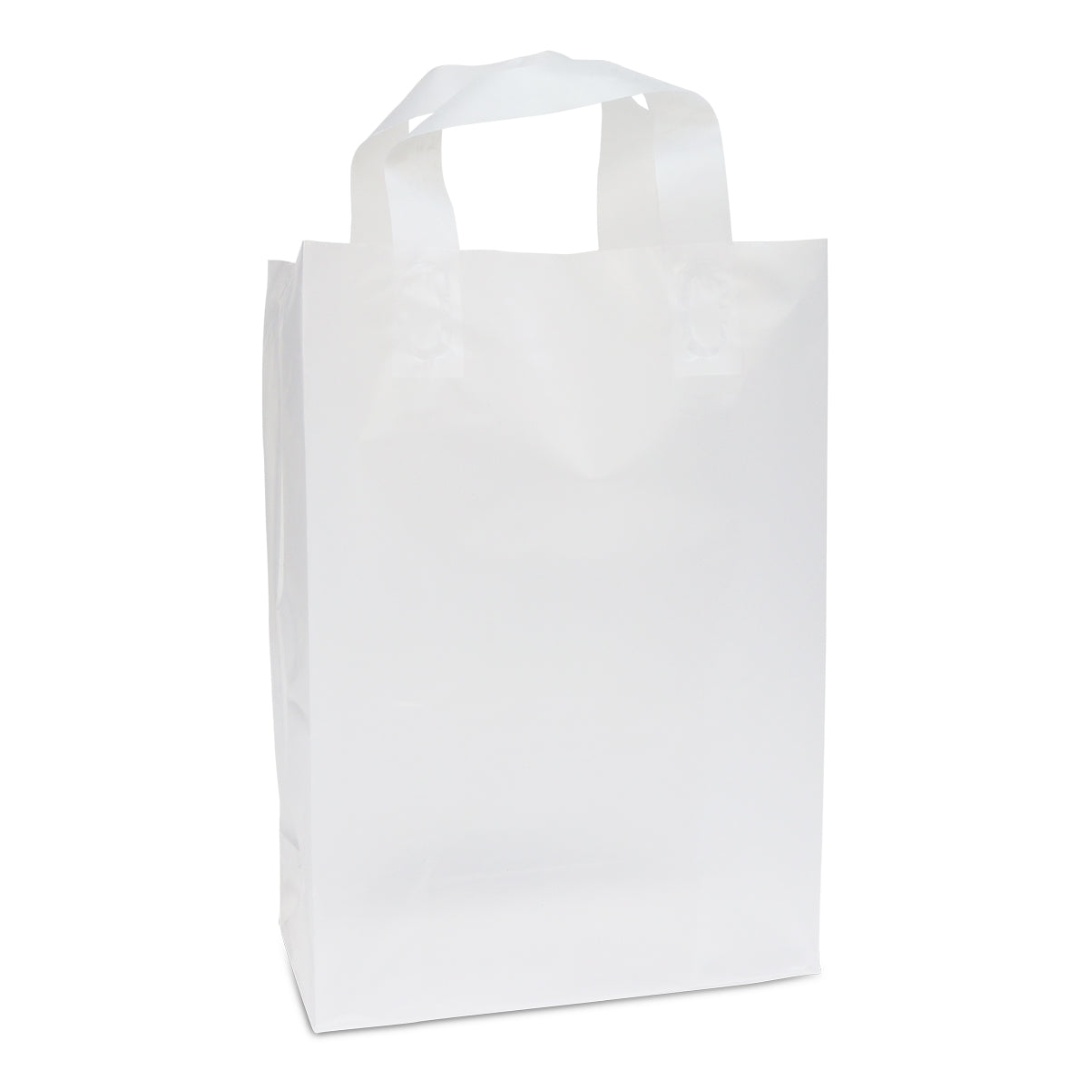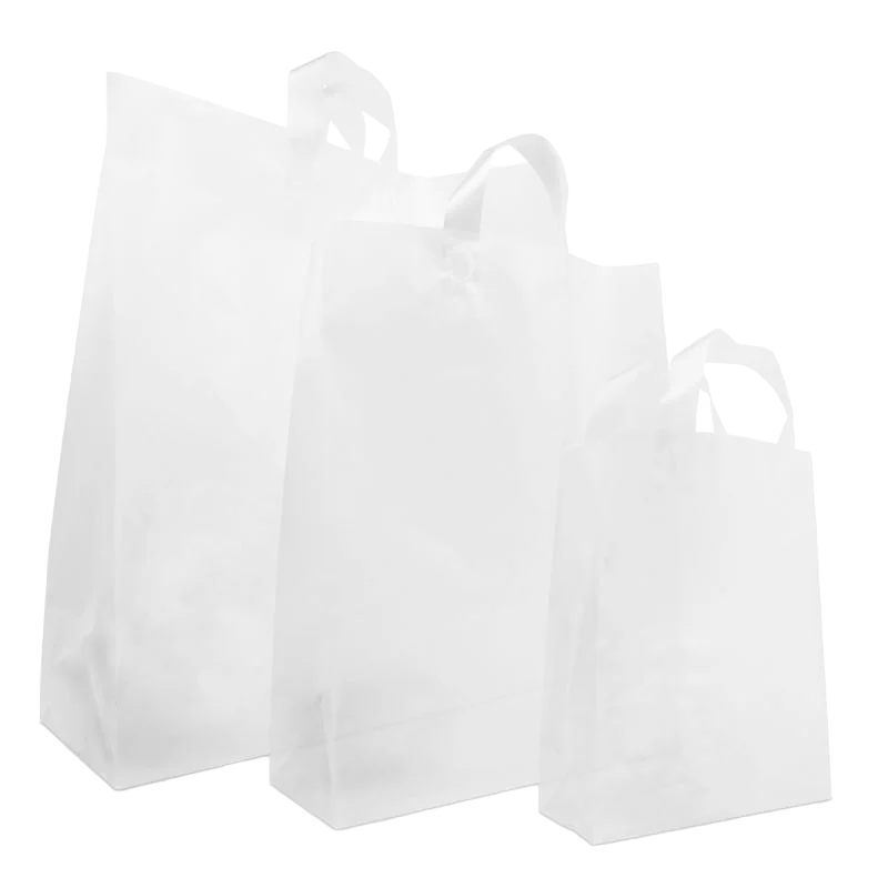Deze tassen zijn vervaardigd uit 75 micron HDPE polyethyleen – een robuust en scheurvast materiaal dat bestand is tegen vocht en dagelijks gebruik. De semi-transparante afwerking zorgt voor een subtiele inkijk, terwijl het gelaste flexiloop handvat een stevige grip garandeert.
